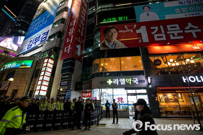 (대구=포커스뉴스) 30일 오후 대구 수성구 새누리당 수성구갑 김문수 후보 선거사무소 앞에 김무성 대표 방문에 앞서 경찰병력이 입구를 에워싸고 있다.