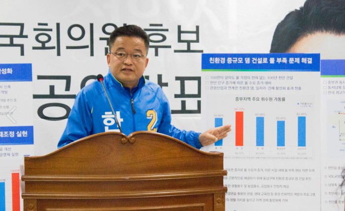 한 후보의 10대 공약은 △수도권 규제완화의 정상화 △천안역사 신축과 역세권 복합개발을 통한 원도심 활성화 △친환경 중규모댐 건설 △천안 시내버스 요금 인하 및 노선 재조정 △중부권 동서내륙철도 건설 △천안역 주변의 상가와 전통시장을 엮는 광역상권 벨트 구축 △재정개혁과 세제개혁을 통한 보편적 복지 토대 마련 △이자제한법 개정을 통한 법정최고 이자 10%로 제한 △청년 일자리 창출 △저소득·저신용자를 위한 가계부채 대책 마련이다.