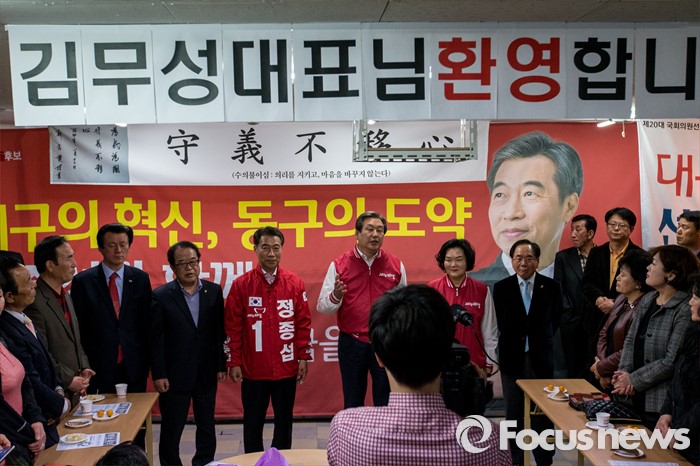 (대구=포커스뉴스) 김무성 새누리당 대표가 30일 오후 대구 동구 새누리당 동구갑 정종섭 후보 선거사무소를 방문 하고 있다.