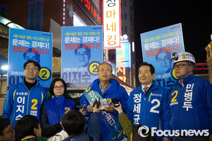 (서울=포커스뉴스) 4.13총선 공식선거운동 첫날인 31일 오전 서울 중구 동대문 신평화시장 앞에서 김종인(왼쪽 세번째) 더불어민주당 대표가 공식 선거유세에 앞서 취재진에게 출사표를 던지고 있다.