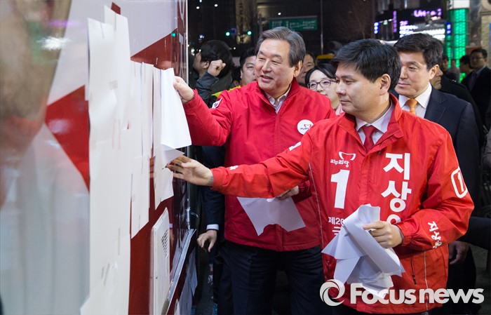 (서울=포커스뉴스) 4.13총선 공식선거운동 첫날인 31일 오전 서울 중구 동대문 누죤 앞에서 김무성 새누리당 공동선대위원장이 지상욱 서울 중구성동구을 후보와 선거유세차량 가림막을 제거하고 있다.
