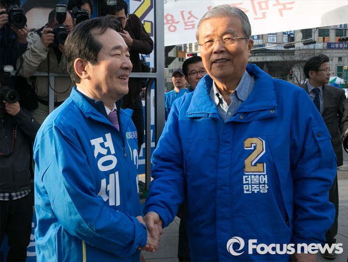 (서울=포커스뉴스) 20대 총선 공식선거 운동이 시작된 31일 오전 서울 동묘앞역 인근 거리에서 김종인(오른쪽) 더불어민주당 비대위 대표 겸 선대위원장과 정세균 서울 종로구 후보가 취재진을 향해 포즈를 취하고 있다.