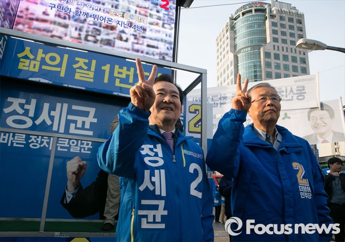 (서울=포커스뉴스) 20대 총선 공식선거 운동이 시작된 31일 오전 서울 동묘앞역 인근 거리에서 김종인(오른쪽) 더불어민주당 비대위 대표 겸 선대위원장과 정세균 서울 종로구 후보가 취재진을 향해 포즈를 취하고 있다.