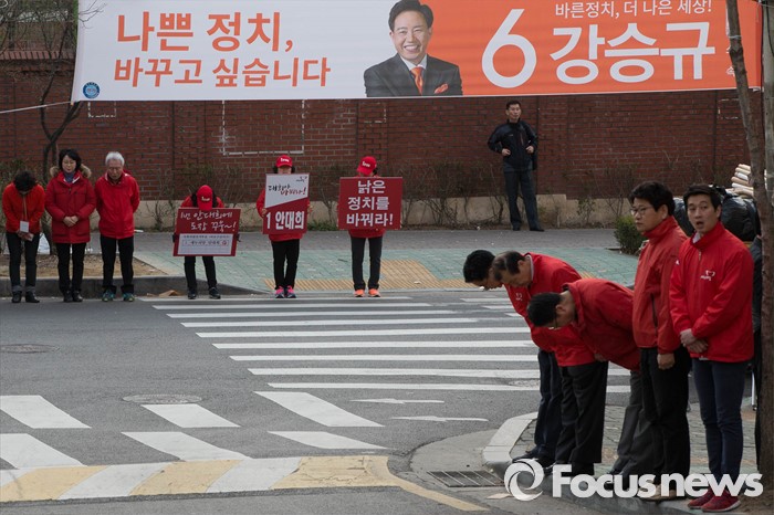 (서울=포커스뉴스) 20대 총선 공식선거 운동이 시작된 31일 오전 서울 마포구의 한 아파트 입구에서 안대희 새누리당 마포구갑 후보측이 출근길 선거유세를 하고 있다.