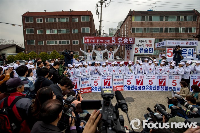 (대구=포커스뉴스) 무소속 대구 동구을 유승민(가운데) 후보, 무소속 대구 북구갑 권은희(왼쪽) 후보, 뭇속 대구 동구갑 류성걸 후보가 31일 오전 대구 동구 공항교에서 열린 공동 출정식을 마친 뒤 손을 맞잡고 있다.