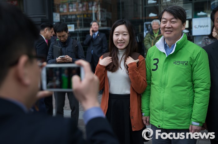 (서울=포커스뉴스) 총선 선거운동이 공식적으로 시작된 31일 오전 안철수 국민의당 상임공동대표가 서울 성북구 성신여대입구역 앞에서 도천수 성북갑 후보 지원 유세를 하던 중 여대생과 기념사진을 찍고 있다.