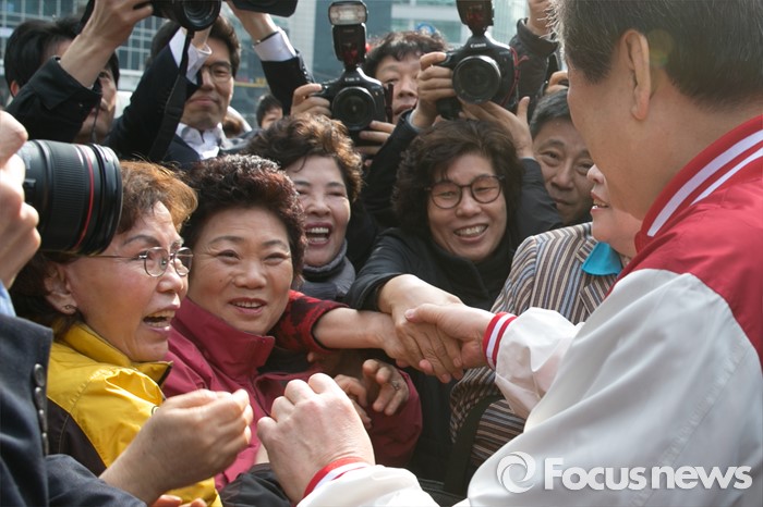 (서울=포커스뉴스) 4.13 총선 공식선거운동이 시작된 31일 오전 서울 구로구 구로디지털단지역 인근 한 대형마트 앞에서 김무성 새누리당 대표가 시민들과 손을 잡고 있다.