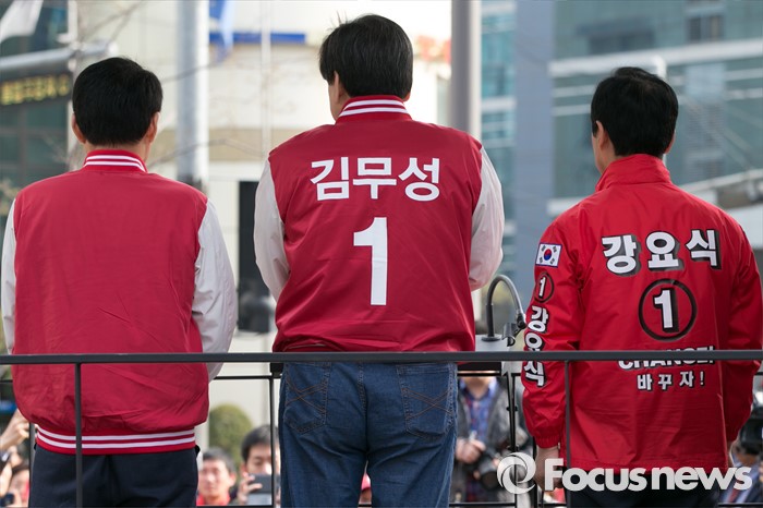 (서울=포커스뉴스) 4.13 총선 공식선거운동이 시작된 31일 오전 서울 구로구 구로디지털단지역 인근 한 대형마트 앞에서 김무성(가운데) 새누리당 대표가 강요식(오른쪽) 구로을 후보 지원유세를 하고 있다.