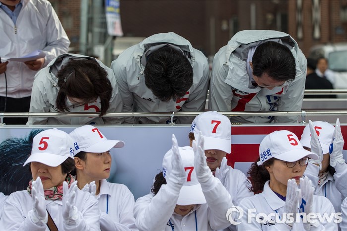 (대구=포커스뉴스) 무소속 대구 동구을 유승민(가운데) 후보, 무소속 대구 북구갑 권은희(왼쪽) 후보, 뭇속 대구 동구갑 류성걸 후보가 31일 오전 대구 동구 공항교에서 열린 공동 출정식을 마친 뒤 지지자들에게 인사 하고 있다.