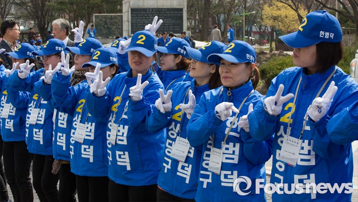 (청주=포커스뉴스) 20대 국회의원 선거운동이 시작된 31일 오전 충북 청주시 상당공원사거리에서 한범덕 후보 선거운동원들이 지지를 호소하고 있다.