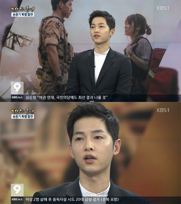 KBS2TV 수목드라마 ‘태양의 후예’의 유시진 대위로 큰 사랑을 받고 있는 송중기가 30일 오후 방송된 ‘KBS 뉴스9’에 깜짝 등장해 눈길을 끌었다. 이날 9시 뉴스에서 송중기는 ‘태양의 후예; 촬영 비하인드 스토리, 송혜교와의 열애설 심경, 한류스타로서의 책임감 등을 언급하며 시청자들의 시선을 사로잡았다.