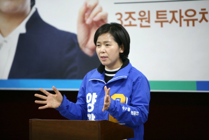 양 후보는 이날 새벽 매월동 농수산물 도매시장에서 첫 선거운동을 시작해 광주 서구을과 서구갑 지역의 경계지역인 운천저수지에서 더민주 송갑석 후보(서구갑)와 함께 출근인사 유세를 했다.양향자 더불어민주당 광주 서구을 후보가 29일 광주시의회 3층 브리핑룸에서 기자회견을 열고 광주 미래자동차 전진기지로 만들기 위한 5가지 공약을 발표하고 있다. <사진출처=양향자 후보 페이스북>