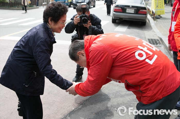 (서울=포커스뉴스) 4.13 총선 공식선거운동이 시작된 31일 오전 서울 마포구 아현시장에서 안대희 새누리당 마포갑 후보가 시민들과 인사하고 있다.
