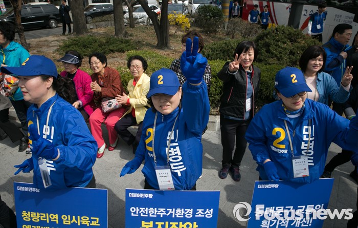 (서울=포커스뉴스) 20대 총선 공식선거 운동이 시작된 31일 오전 서울 장안동사거리에서 민병두 더불어민주당 동대문을 후보 선거운동원들이 지지를 호소하고 있다.