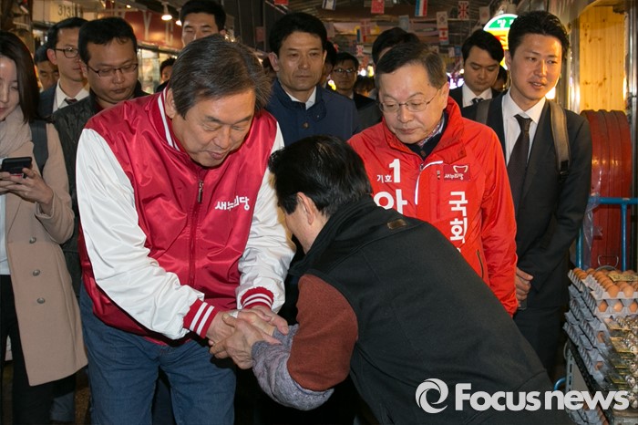 (서울=포커스뉴스) 4.13 총선 공식선거운동이 시작된 31일 오전 서울 마포구 아현시장에서 김무성(왼쪽) 새누리당 대표가 안대희 마포갑 후보와 함께 상인들에게 인사하고 있다.