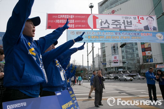 (서울=포커스뉴스) 20대 총선 공식선거 운동이 시작된 31일 오전 서울 장안동사거리에서 민병두 더불어민주당 동대문을 후보 선거운동원들이 지지를 호소하고 있다.