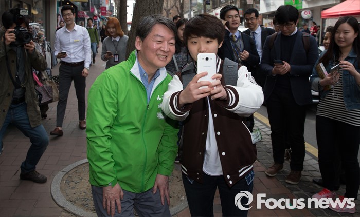 (서울=포커스뉴스) 총선 선거운동이 공식적으로 시작된 31일 오전 안철수 국민의당 상임공동대표가 서울 마포구 이대역 앞에서 홍성덕 서대문을 후보 지원 유세를 하던 중 한 여학생과 셀카를 찍고 있다.