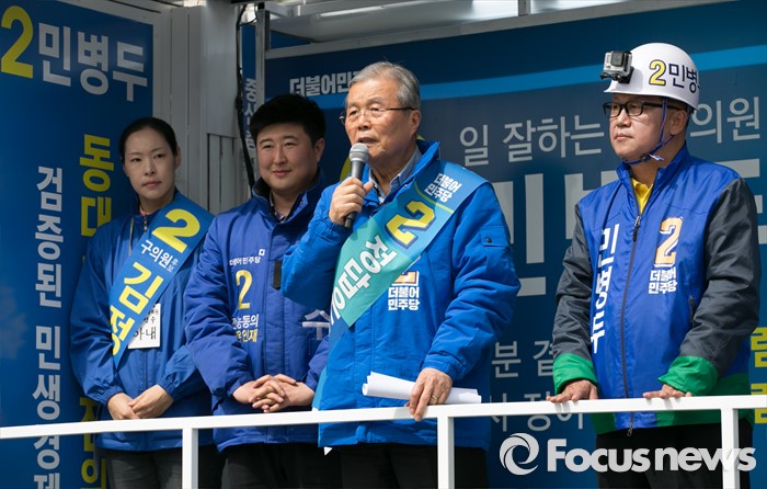 (서울=포커스뉴스) 20대 총선 공식선거 운동이 시작된 31일 오전 서울 장안동사거리에서 열린 민병두 더불어민주당 동대문을 후보 출정식에 참석한 김종인 비대위 대표 겸 선대위원장이 지지를 호소하고 있다.