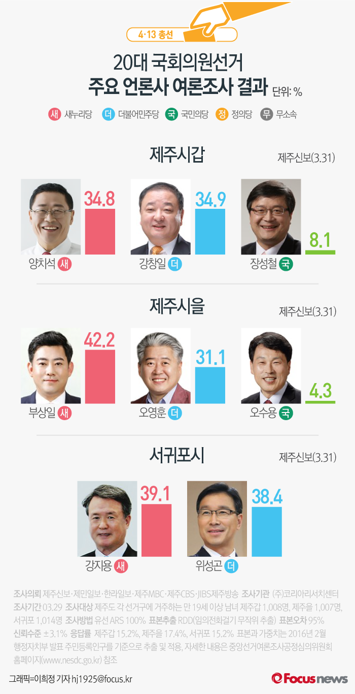 (서울=포커스뉴스) 제주신보와 제민일보, 한라일보, 제주MBC, 제주CBS, JIBS제주방송 등 제주지역 언론 6사가 ㈜코리아리서치센터에 의뢰해 31일 발표한 제주3곳(제주갑, 제주을, 서귀포)의 여론조사 실시했다.