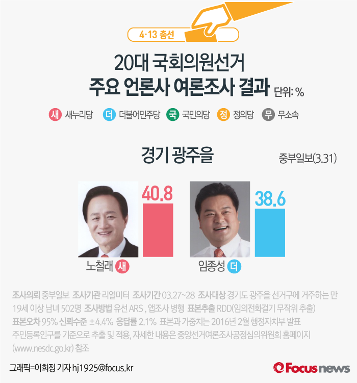 (서울=포커스뉴스) 중부일보가 리얼미터에 의뢰해 31일 발표한 여론조사 결과에 따르면 새누리당 노철래 후보의 지지율은 40.8%, 더불어민주당 임종성 후보의 지지율은 38.6%를 기록했다.