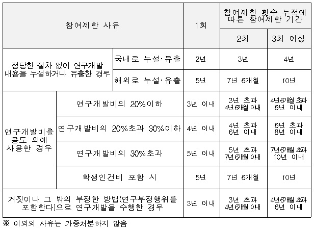 과거에 연구비 비리를 일으켜 참여제한 처분을 받은 자가 동일 사유로 다시 참여제한 처분을 받은 경우 기존 최대 5년에서 10년의 범위에서 정부연구개발사업의 참여를 제한한다. 연구비리에는 △R&D 내용 누설‧유출 △연구비 용도 외 사용 △부정한 방법으로 R&D 수행 등이 포함된다. 동일 사유로 관련 규정 2회 위반 시 50%(1.5배), 3회 위반 시 100%(2배) 가중하게 된다.