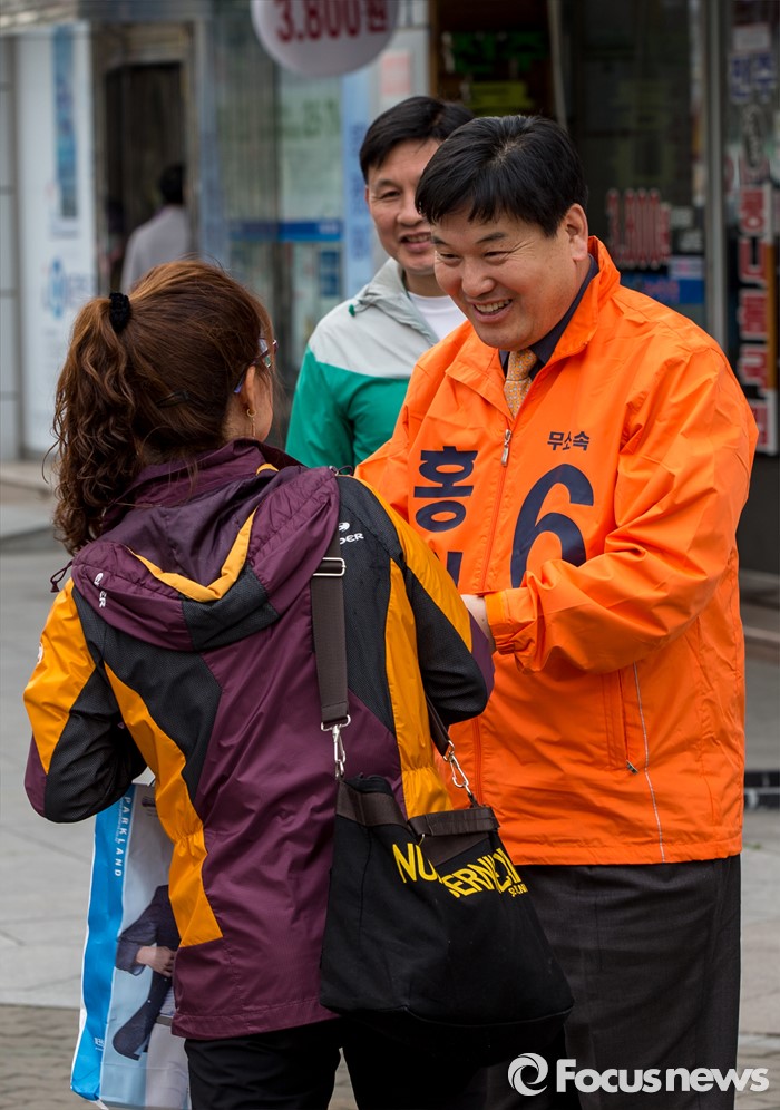 (대구=포커스뉴스) 무소속 대구 북구을 홍의락 후보가 31일 오후 대구 북구 칠곡네거리에서 유권자들에게 한 표를 호소 하고 있다.