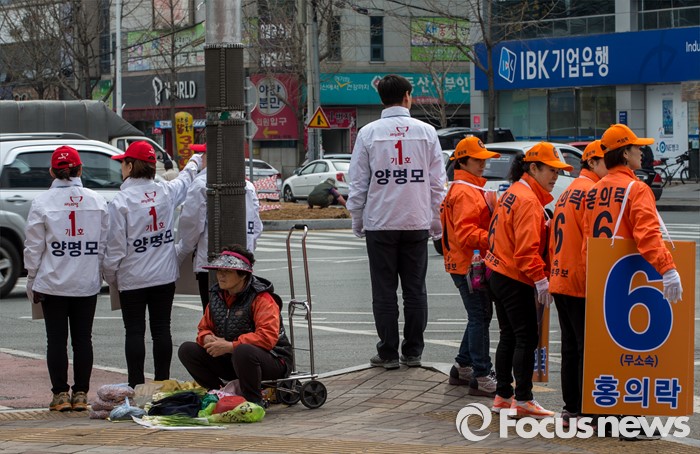 (대구=포커스뉴스) 31일 오후 대구 북구 칠곡네거리에서 새누리당 대구 북구을 양명모 후보 선거운동원과 무소속 대구 북구을 홍의락 후보 선거운동원이 지역주민들에게 한표를 호소 하고 있다.
