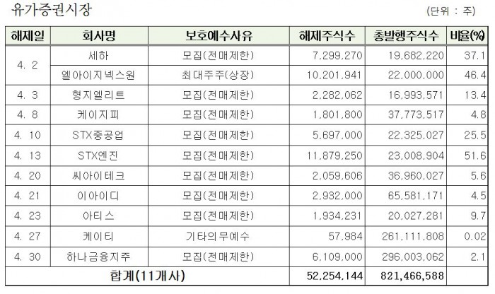 유가증권시장에서는 세하, LIG넥스원, 형지엘리트, KGP, STX중공업, STX엔진, 씨아이테크, 이아이디, 아티스, KT, 하나금융지주의 보호예수가 해제된다.