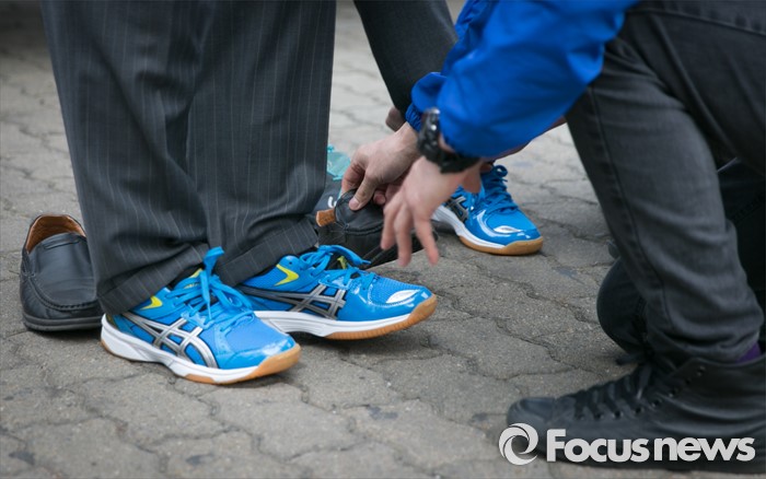 (안산=포커스뉴스) 20대 총선 공식선거 운동이 시작된 31일 오후 경기도 홈플러스 안산고잔점 앞에서 열린 더불어민주당 안산 집중유세에 참석한 손창원 안산 단원을 후보 내외가 사위들로부터 운동화를 선물받고 있다.