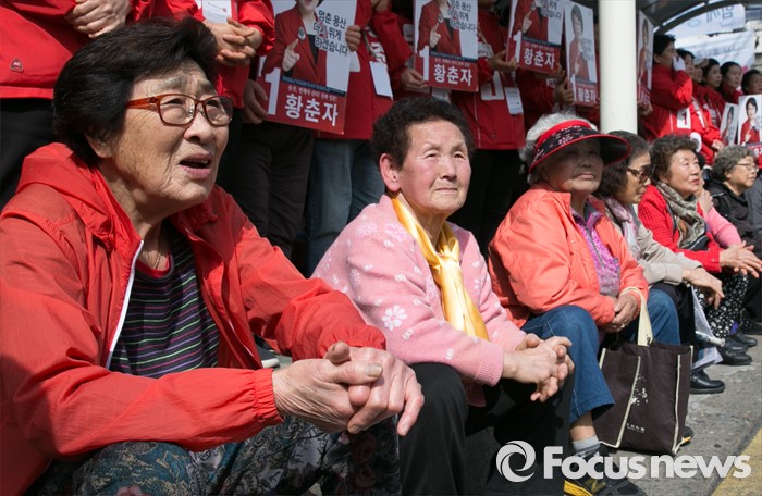 (서울=포커스뉴스) 4.13 총선 공식선거운동이 시작된 31일 오후 서울 용산구 후암시장 앞에서 어르신들이 황춘자 새누리당 용산 후보의 유세를 보고 있다.