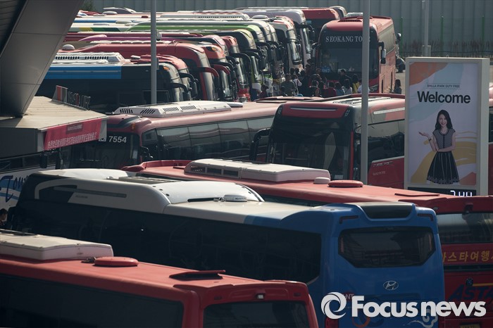 (서울=포커스뉴스) 한국을 방문 중인 중국 아오란 그룹 임직원 6000여 명이 31일 오후 서울 용산구의 한 면세점을 찾아 쇼핑한 뒤 버스에 탑승하고 있다.