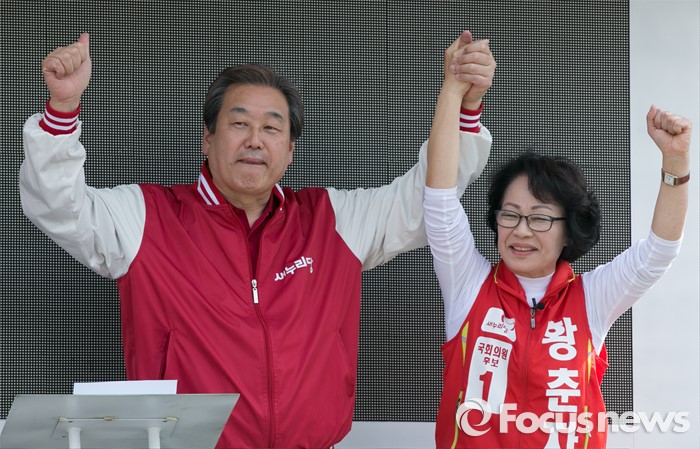 (서울=포커스뉴스) 4.13 총선 공식선거운동이 시작된 31일 오후 서울 용산구 후암시장 앞에서 김무성(왼쪽) 새누리당 대표가 황춘자 용산 후보 지원유세를 하고 있다.