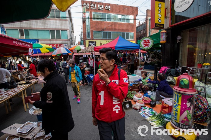 (대구=포커스뉴스) 새누리당 대구 수성구갑 김문수 후보가 31일 오후 대구 수성구 신매시장을 방문해 유권자들에게 한 표를 호소 하고 있다.