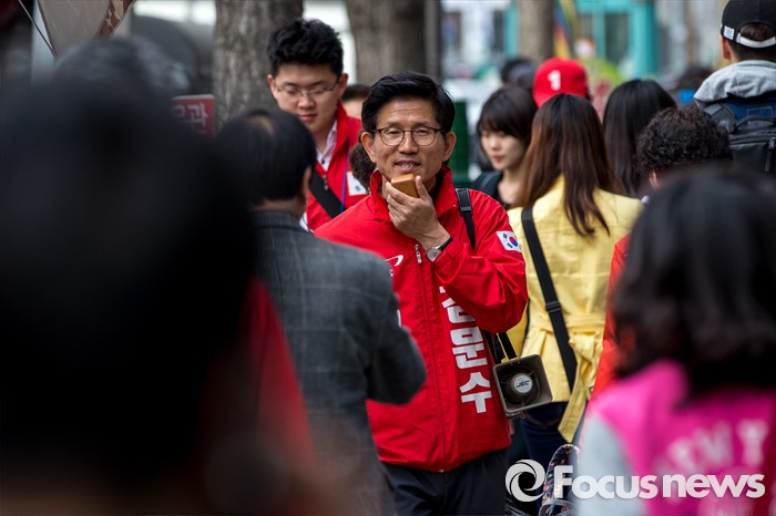 (대구=포커스뉴스) 새누리당 대구 수성구갑 김문수 후보가 31일 오후 대구 수성구 신매시장을 방문해 유권자들에게 한 표를 호소 하고 있다.
