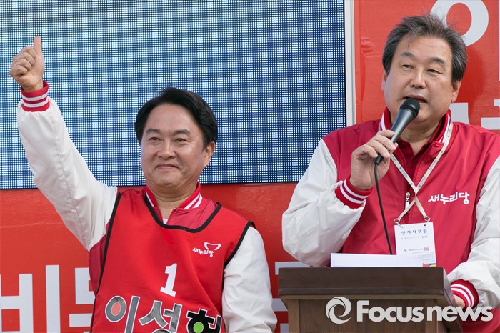 (서울=포커스뉴스) 4.13 총선 공식선거운동이 시작된 31일 오후 서울 서대문구 독립문공원에서 김무성(오른쪽) 새누리당 대표가 이성헌 서대문갑 후보 출정식에 참석해 연설을 하고 있다.