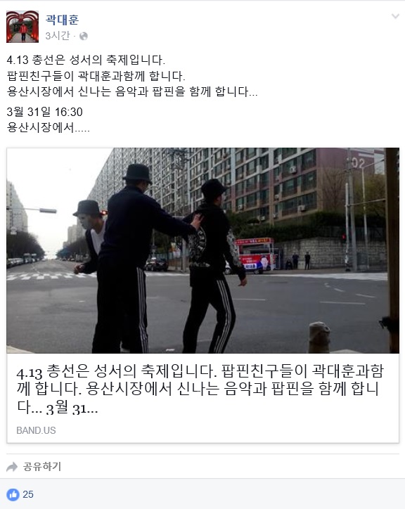 이날 곽 후보는 자신의 페이스북에 관련 사진과 함께 "4·13 총선은 성서(대구 달서구 성서산업단지)의 축제다"라는 글을 올리며 팝핀과 선거유세를 접목한 이유에 대해 설명했다.
