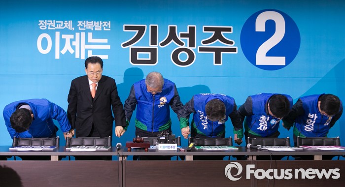 (전주=포커스뉴스) 1일 오전 김성주 더불어민주당 전북 전주병 후보 선거사무소에서 열린 중앙당선거대책위원회의에 참석한 김종인 비대위 대표 겸 선대위원장 등 참석자들이 손을 들어 포즈를 취하고 있다. 왼쪽부터 이석행, 송현섭 부위원장, 김 대표, 김 후보, 최형재 전주을 후보, 박희승 남원·임실·순창 후보.