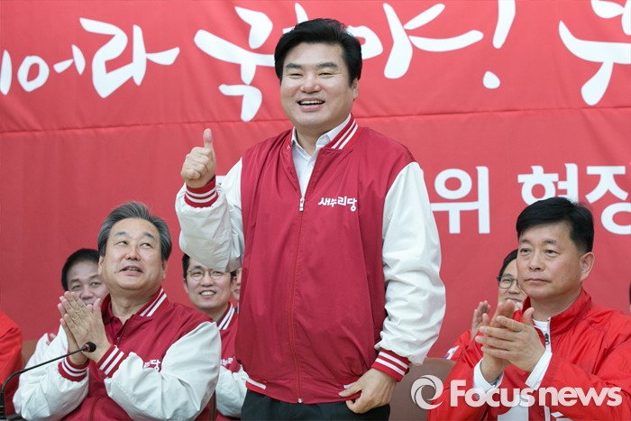 (수원=포커스뉴스) 김무성(왼쪽) 새누리당 대표가 1일 오전 경기도 수원시 장안구 정조로 새누리당 경기도당에서 열린 중앙선대위 회의에 참석해, 평택갑에 출마한 원유철(가운데) 원내대표를 향해 박수치고 있다.