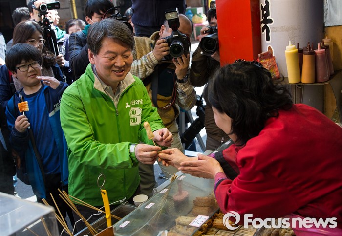 (안양=포커스뉴스) 안철수 국민의당 상임공동대표가 1일 오전 안양시 동안구 중앙시장에서 백종주 동안구갑 후보 지원 유세 중 한 상인에게 핫바를 건네받고 있다.