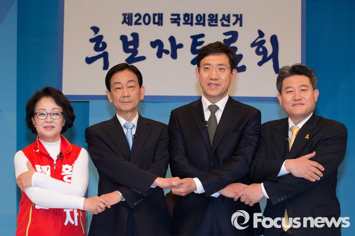 (서울=포커스뉴스) 1일 오전 서울 마포구 서강대 스튜디오에서 제20대 국회의원선거 용산구 후보자들이 지역 케이블 토론회 전 포토타임을 갖고 있다. 왼쪽부터 황춘자 새누리당 후보, 진영 더불어민주당 후보, 곽태원 국민의당 후보, 정연욱 정의당 후보.