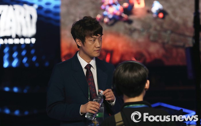 (서울=포커스뉴스) 1일 오전 서울 송파구 올림픽공원 올림픽홀에서 열린 '2016 히어로즈 오브 더 스톰 스프링 챔피언십' 개막식에 참여한 스타크래프트 프로게이머 출신 김정민 해설위원이 중계 준비를 하고 있다.