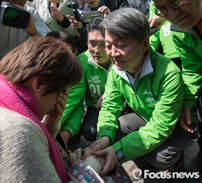 (군포=포커스뉴스) 안철수 국민의당 상임공동대표가 1일 오전 경기 군포시 산본로데오거리 원형광장에서 정기남 군포시을 후보 지원 유세 중 오열하는 한 여성 지지자의 손을 잡아주고 있다.