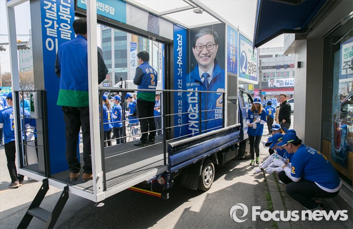 (전주=포커스뉴스) 1일 오전 전북 전주 모래내시장 입구에서 열린 더불어민주당 최형재 전주을, 김성주 전주병 후보 유세에 참여한 선거운동원들이 잠시 휴식을 보내고 있다.