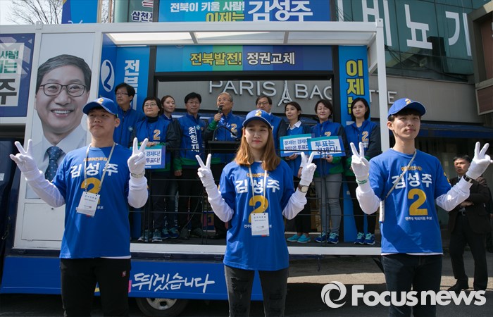 (전주=포커스뉴스) 1일 오전 전북 전주 모래내시장 입구에서 열린 더불어민주당 최형재 전주을, 김성주 전주병 후보 유세에 참여한 김종인 비대위 대표 겸 선대위원장이 지지를 호소하고 있다.