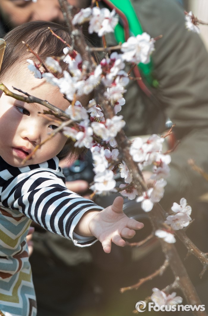 (서울=포커스뉴스) 봄 기운이 완연한 1일 오후 서울 여의도 한강공원을 찾은 어린이가 만개한 벚꽃을 만지고 있다.