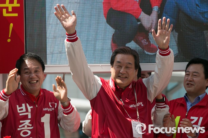 (수원=포커스뉴스) 1일 오전 경기도 수원시 팔달구 수원역 로데오거리 입구에서 열린 새누리당 수원지역 후보 합동유세에 참석한 김무성 새누리당 대표가 손을 흔들고 있다.