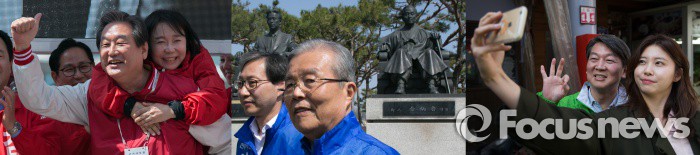(수원,전주,안양=포커스뉴스)4.13총선 D-12일 인 1일 김무성(사진왼쪽) 새누리당대표는 수원 지원유세에서 정미경후보를 등에 업고 있고, 김종인(가운데) 더 민주 대표는 전주 덕진공원에 위치한 조부 김병로선생의 동상을 찾았으며, 안철수 국민의당 공동대표는 안양 지원유세에서 지지자와 폰카를 찍고 있다.
