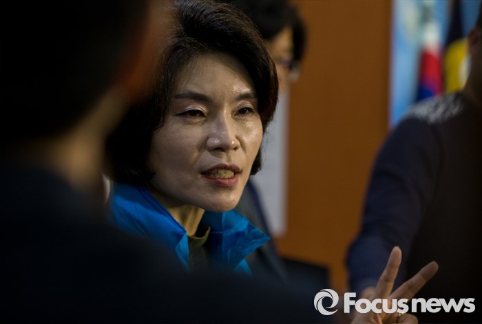 (서울=포커스뉴스) 한정애 더불어민주당 강서병 후보가 1일 오후 서울 여의도 국회 정론관에서 국민의당 김성호 후보와 단일화에 대한 기자회견을 하고 있다. 서울 강서병 지역 한정애 더민주 후보, 김성호 국민의당 후보 간의 단일화는 첫 수도권 단일화 합의로 관심을 모았으나 당명 사용 문제가 해결되지 않아 진통을 겪을 예상이다.