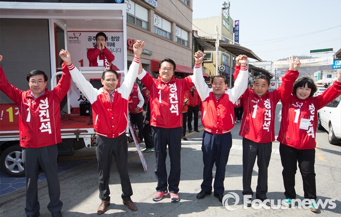 (공주=포커스뉴스) 1일 충남 공주시 산성시장 일원에서 정진석 새누리당 후보가 지지를 호소하고 있다.