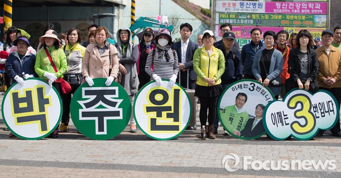 (안산=포커스뉴스) 국민의당 선거운동 봉사자들이 1일 오후 안산시 상록구 상록수역 월드프라자 앞에서 김영환 상록구을 후보와 박주원 상록구갑 후보 지원 유세를 하고 있다.